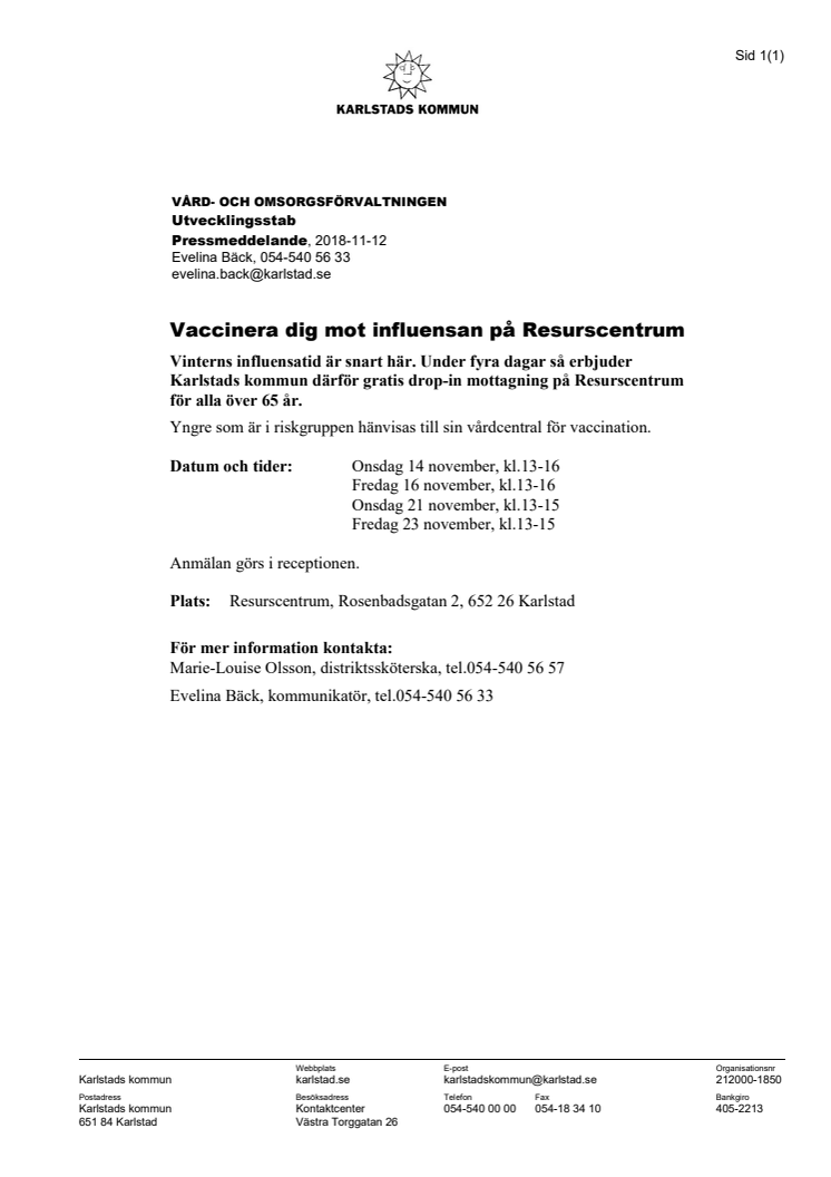 Vinterns influensatid är snart här. Under fyra dagar så erbjuder Karlstads kommun därför gratis drop-in mottagning på Resurscentrum för alla över 65 år.