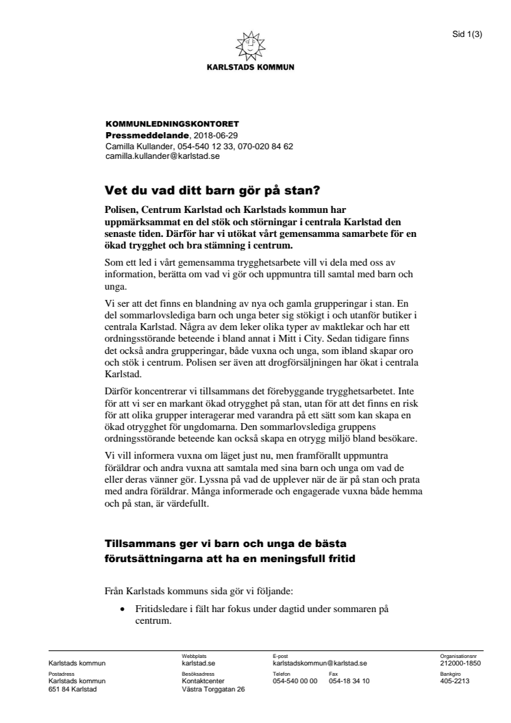 Polisen, Centrum Karlstad och Karlstads kommun har uppmärksammat en del stök och störningar i centrala Karlstad den senaste tiden. Därför har vi utökat vårt gemensamma samarbete för en ökad trygghet och bra stämning i centrum.