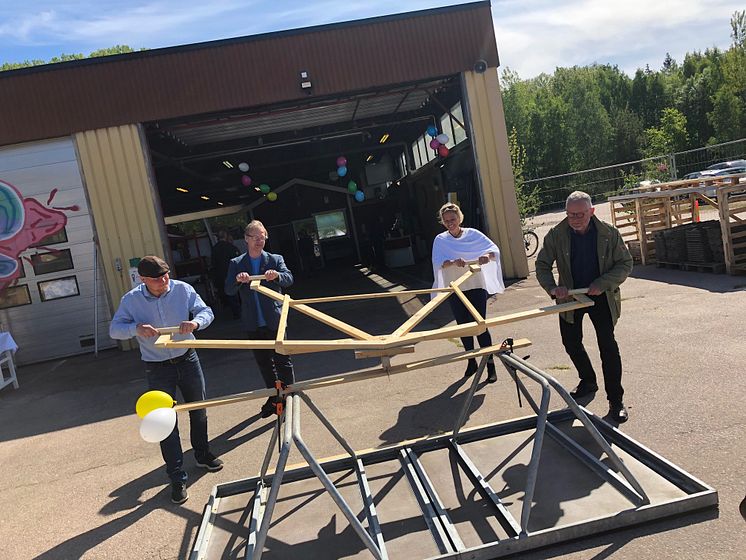 Från vänster: Henrik Lander, Torbjörn Nilsson, Helena Kjäll, Per-Inge Lidén. Sågen är utformad för att hålla social distansering med tanke på det rådande coronaläget.