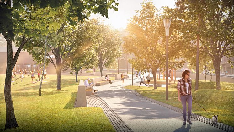 lllustrationsbild av utegym och promenadstråk mellan Mariebergsskogen och Jakobsbergsskogen.