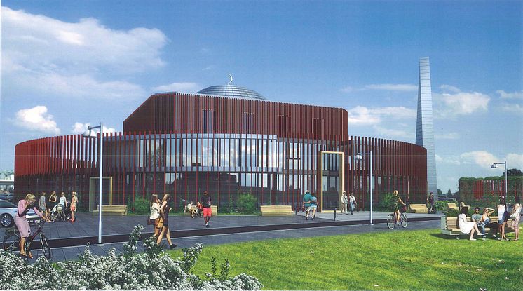 Arkitektskiss över den planerade moskén på Rud i Karlstad.