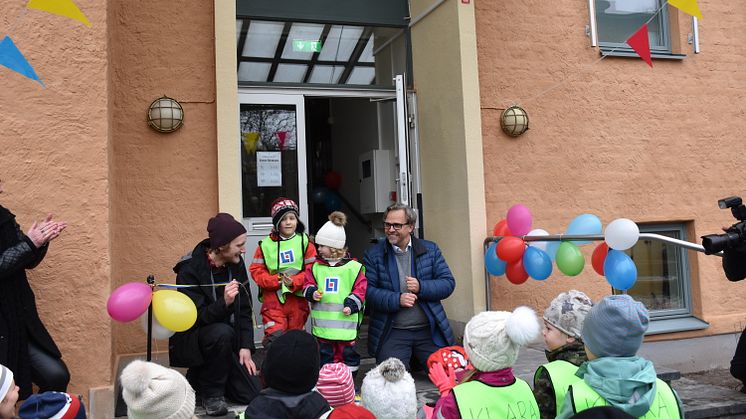 Barn- och ungdomsnämndens ordförande Niklas Wikström (L), invigde de nya lokalerna på Bryggaregatan 9 tillsammans med barn, pedagoger och förskolechef.