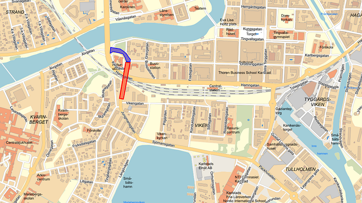 Korsningen Klaraborgsgatan/Drottninggatan byggs om för att underlätta flödet mot Vikenförbindelsen vilket innebär att bilar inte kommer kunna svänga vänster in till Drottninggatan. Istället skapas ett tillfälligt vänstersvängfält för bussen på Hamngatan, så att de kan komma till bussstationen på ett smidigt sätt.