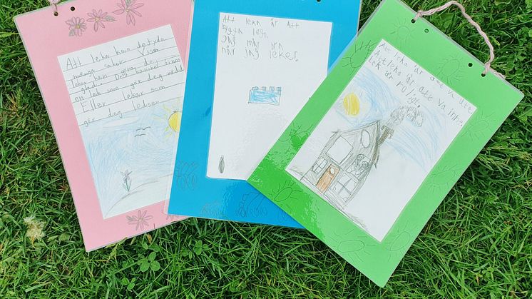 Under ett par veckor har eleverna i årskurs ett och två på Råtorpsskolan skrivit dikter med temat lek. Med individuella tolkningar av temat har fina diktverk skapats som nu kommer att få pryda träden på Råtorps Café i sommar. På plats under den ceremoniella vernissagen med bandklippning är eleverna i årskurs ett.