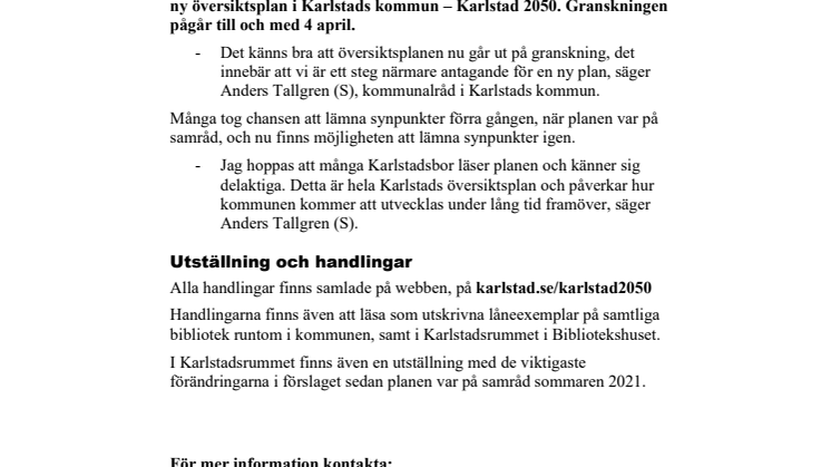 - Jag hoppas att många Karlstadsbor läser planen och känner sig delaktiga. Detta är hela Karlstads översiktsplan och påverkar hur kommunen kommer att utvecklas under lång tid framöver, säger Anders Tallgren (S).