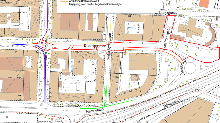 - Godstransporter till centrumkärnan kan åka på Östra Torggatan norrut från Hamngatan och sedan köra in på Drottninggatan mot Soltorget. De kommer även att kunna ta sig fram från Södra Kyrkogatan, västerut på Drottninggatan och sen ta höger ut på Östra Torggatan, men det är begränsad framkomlighet. Även färdtjänst kommer att kunna ta sig fram via Södra Kyrkogatan och västerut på Drottninggatan, men med begränsad framkomlighet.