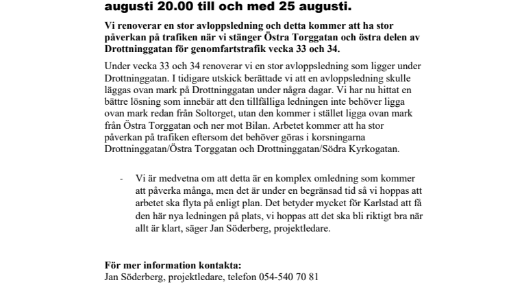 Vi renoverar en stor avloppsledning och detta kommer att ha stor påverkan på trafiken när vi stänger Östra Torggatan och östra delen av Drottninggatan för genomfartstrafik vecka 33 och 34.