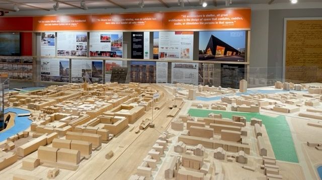 Utställningen försöker illustrera arkitekturens bredd, från stadsbyggnadsvisioner till gestaltningen av kollektivtrafikväntplatser.