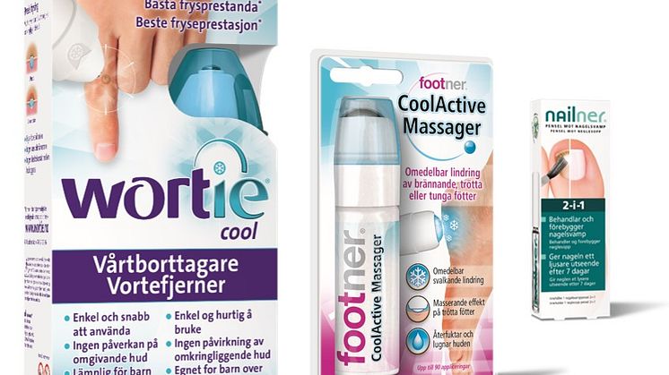 Försäljningsställen: Footner, Nailner och Wortie säljs på apotek. Rekommenderade cirkapriser: Footner Exfoliating Socks: 249 kr, Footner CoolActive Massager: 279 kr. Nailner Behandla & Färga: 349 kr, Nailner 2 i1: 329 kr, Nailner Nagellack som andas: 99 kr. Wortie Cool: 259 kr, Wortie Advance: 349 kr, Wortie Liquid: 299 kr.