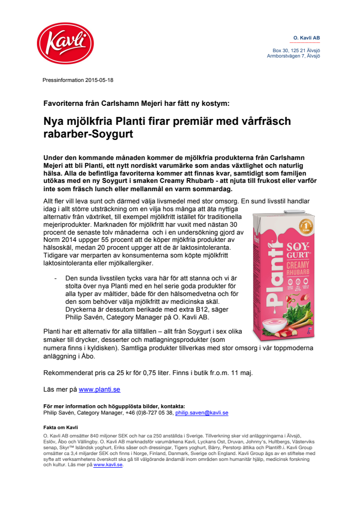 Under den kommande månaden kommer de mjölkfria produkterna från Carlshamn Mejeri att bli Planti, ett nytt nordiskt varumärke som andas växtlighet och naturlig hälsa. Alla de befintliga favoriterna kommer att finnas kvar, samtidigt som familjen utökas med en ny Soygurt i smaken Creamy Rhubarb - att njuta till frukost eller varför inte som fräsch lunch eller mellanmål en varm sommardag.