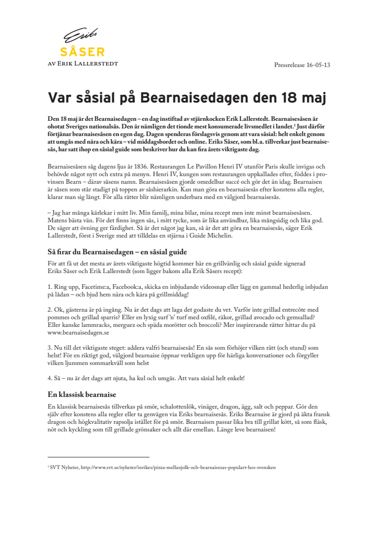Den 18 maj är det Bearnaisedagen – en dag instiftad av stjärnkocken Erik Lallerstedt. Bearnaisesåsen är ohotat Sveriges nationalsås. Den är nämligen det tionde mest konsumerade livsmedlet i landet. Just därför förtjänar bearnaisesåsen en egen dag. Eriks Såser, som bl.a. tillverkar just bearnaisesås, har satt ihop en såsial guide som beskriver hur du kan fira årets viktigaste dag.