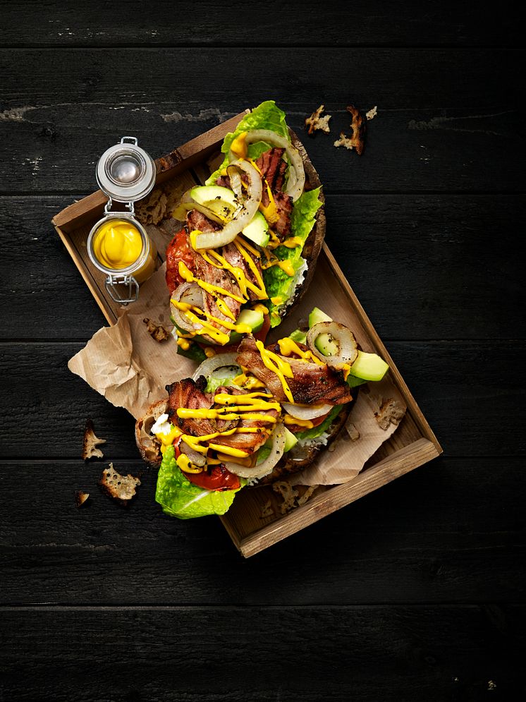 Grillat surdegsbröd med färskost, avokado och rimmat fläsk