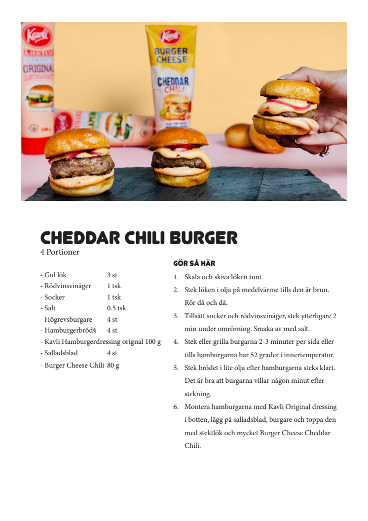 Cheddar Chili är en naturlig partner till Kavlis Amerikansk Dressing, Sveriges mest sålda hamburgerdressing, och utmanar dig att bli mindre fyrkantig i köket. Kavli ser fram emot att följa hur hemmakockar inspireras av den nya smaken och utforskar både klassiska och kreativa sätt att använda produkten.