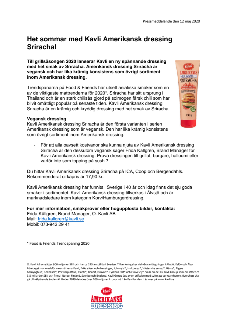 Till grillsäsongen 2020 lanserar Kavli en ny spännande dressing med het smak av Sriracha. Amerikansk dressing Sriracha är vegansk och har lika krämig konsistens som övrigt sortiment inom Amerikansk dressing.
