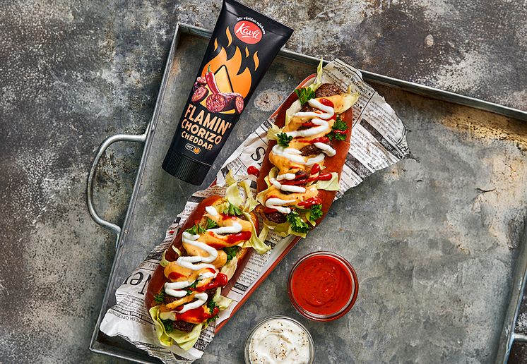 Kavli Hot Serien med sin särskiljande design och förpackningsform (stående tuber) har intressanta tillbehör till mackor & enklare ”hand-held” food. Konsumenterna uppfattar Kavli Hot serien som moderna och spännande alternativ till andra pålägg och fyllningar. Både cheddar och chorizo passar perfekt för den här typen av ost eftersom de kopplas ihop med just med street food.