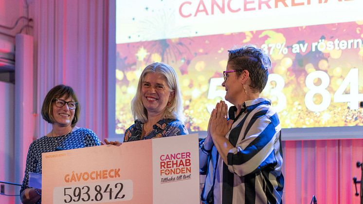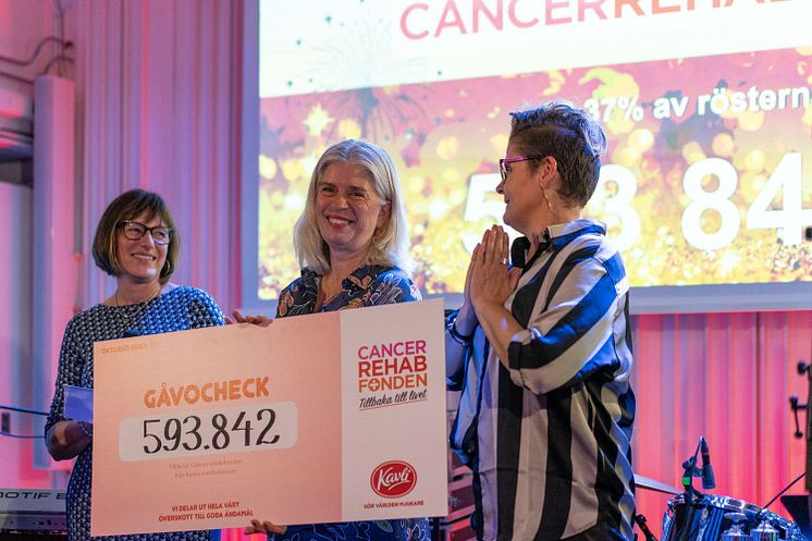 Flest röster även i år fick CancerRehabFonden, till vilka Kavli medarbetare Anna-Lena Nilsson delade ut en check på 593 842 kronor.
