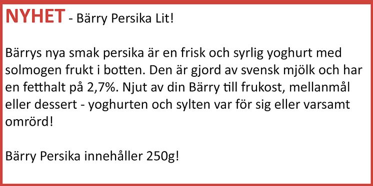 Bärry är sedan länge en favorit hos svenskarna, den har funnits sen 1969 och var den första smaksatta yoghurten där sylten ligger i botten. Inför sommaren lanseras en ny smak, Persika. Den nya smaken har den karaktäristiska syrliga naturella yoghurten på toppen och en ljuvligt, somrig persikosylt i botten. Det gäller att passa på att smaka Bärry Persika då den är en limited edition!