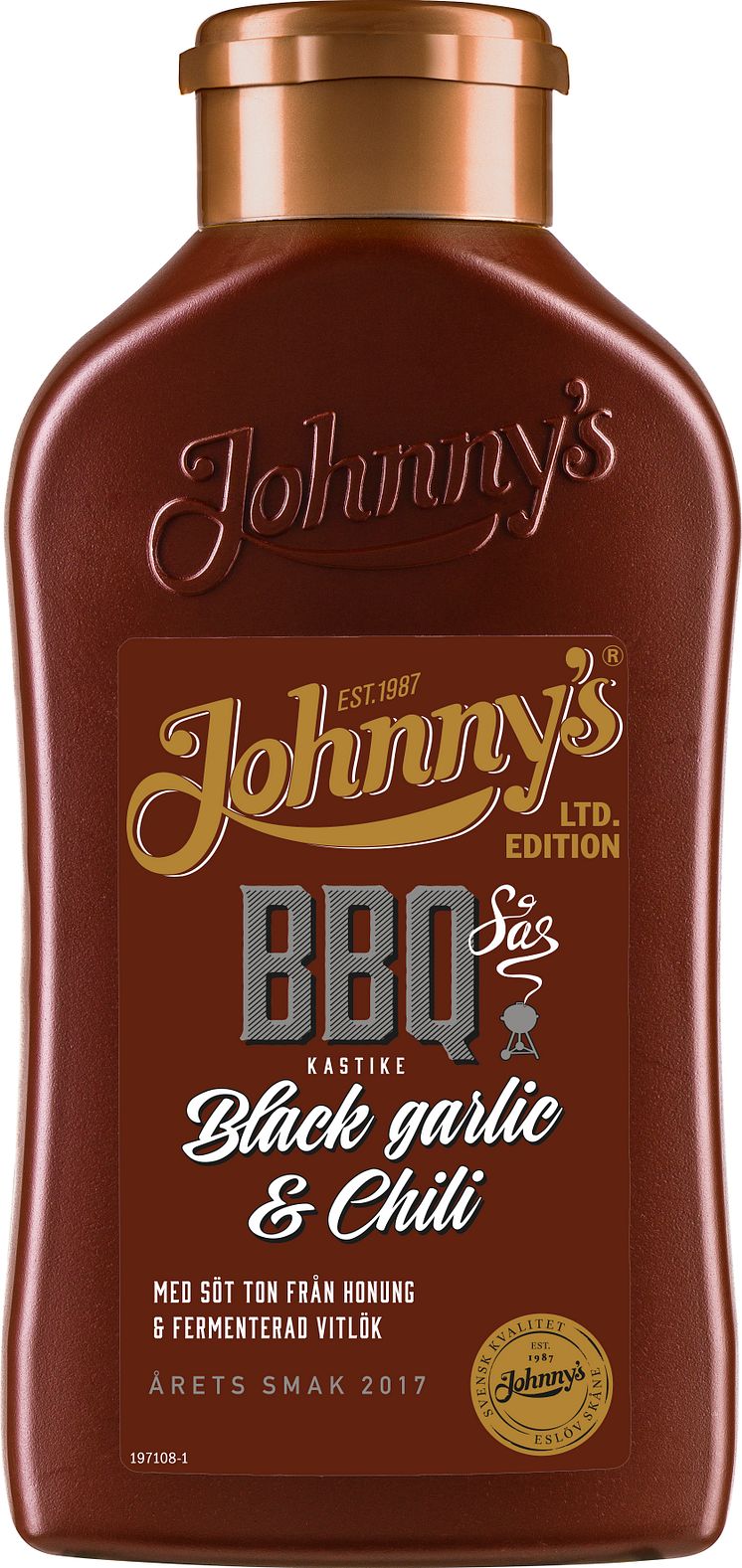 BBQ-sås Black Garlic & Chili Johnny’s® nya BBQ-sås har en sötaktig honungston från den fermenterade vitlöken och en härlig hetta från chilin. Såsen doftar rökigt och har en varm träkaraktär. Den passar utmärkt till allt från ribs, pulled pork, plankstek och hamburgare till grillad vattenmelon med fetaost.
