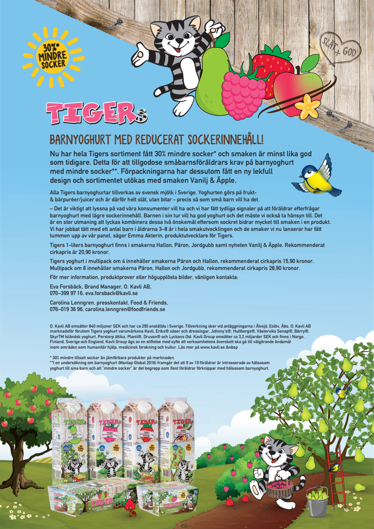 – Det är viktigt att lyssna på vad våra konsumenter vill ha och vi har fått tydliga signaler på att föräldrar efterfrågar barnyoghurt med lägre sockerinnehåll. Barnen i sin tur vill ha god yoghurt och det måste vi också ta hänsyn till. Det är en stor utmaning att lyckas kombinera dessa två önskemål eftersom sockret bidrar mycket till smaken i en produkt. Vi har jobbat tätt med ett antal barn i åldrarna 3–8 år i hela smakutvecklingen och de smaker vi nu lanserar har fått tummen upp av vår panel, säger Emma Akterin, produktutvecklare för Tigers.