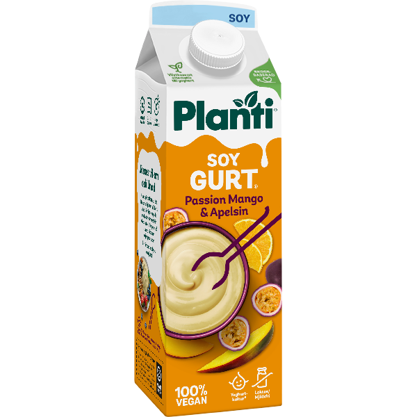 Planti Soygurt Passion, Mango & Apelsin säljs i 1000 g:s förpackning.