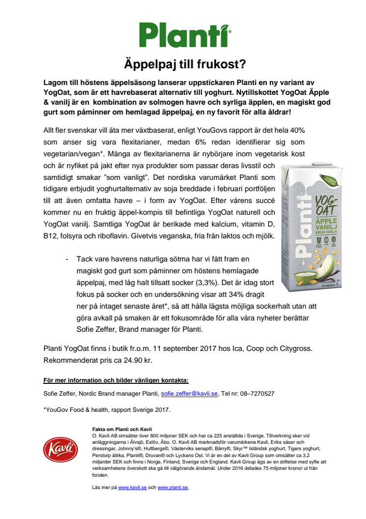 Allt fler svenskar vill äta mer växtbaserat, enligt YouGovs rapport är det hela 40% som anser sig vara flexitarianer, medan 6% redan identifierar sig som vegetarian/vegan*. Många av flexitarianerna är nybörjare inom vegetarisk kost och är nyfiket på jakt efter nya produkter som passar deras livsstil och samtidigt smakar ”som vanligt”. Det nordiska varumärket Planti som tidigare erbjudit yoghurtalternativ av soja breddade i februari portföljen till att även omfatta havre – i form av YogOat. Efter vårens succé kommer nu en fruktig äppel-kompis till befintliga YogOat naturell och YogOat vanilj. Samtliga YogOat är berikade med kalcium, vitamin D, B12, folsyra och riboflavin. Givetvis veganska, fria från laktos och mjölk.