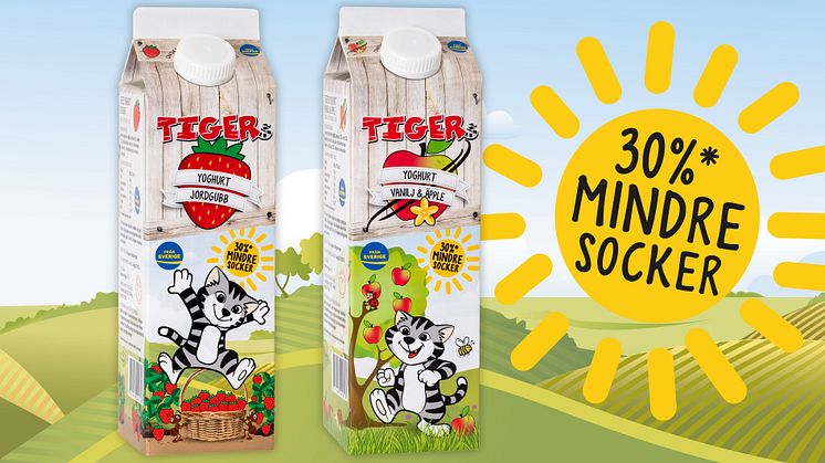 Nu har hela Tigers sortiment fått 30% mindre socker* och smaken är minst lika god som tidigare. Detta för att tillgodose småbarnsföräldrars krav på barnyoghurt med mindre socker**. Förpackningarna har dessutom fått en ny lekfull design och sortimentet utökas med smaken Vanilj & Äpple.