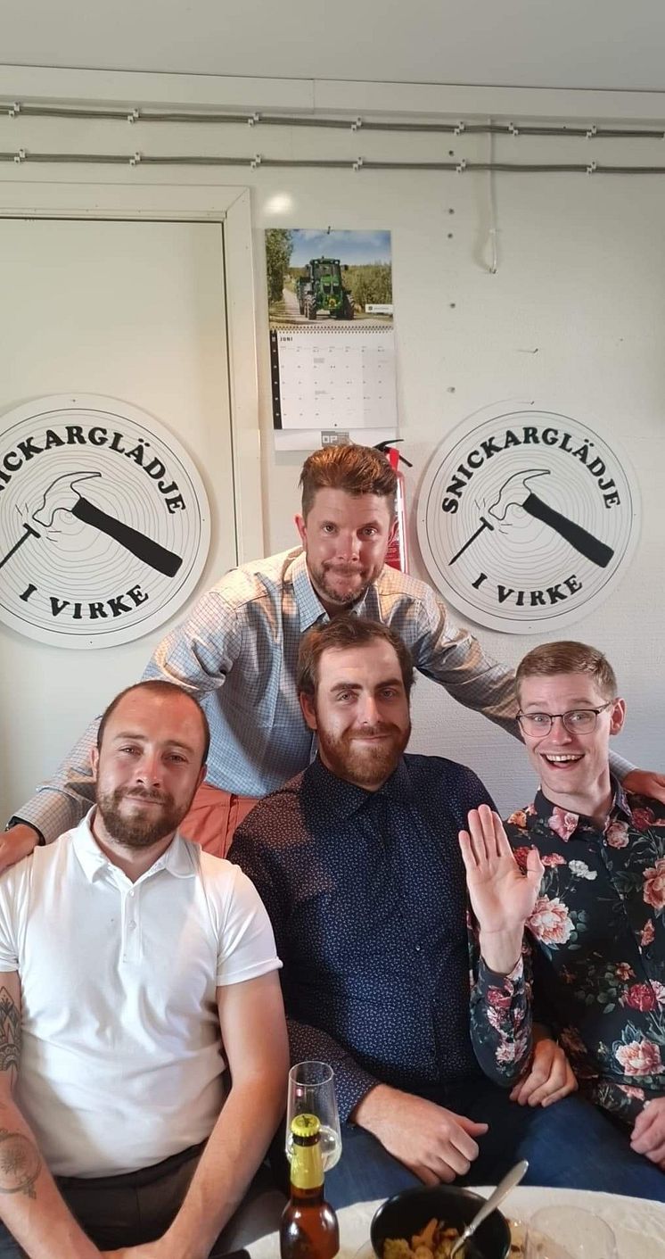 Årets Entreprenör 2020, Fredrik Friberg med Snickarglädje i Virke, tillsammans med medarbetarna Sebastian Nilsson, Marcus Mårtensson och Patrik Mårtensson.