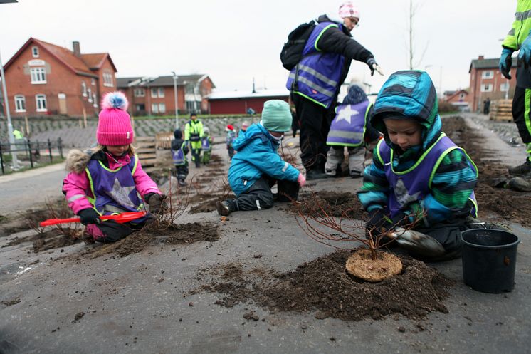 Många plantor skulle ned i marken när barnen från Nyadala förskola hjälpte till att få klart parken vid nya tågstationen i Furulund - en plats som nu blir en viktig del av ortsutvecklingen och barnens framtid i Furulund.
