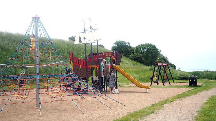 Vill du ha det tyst omkring dig gör du rätt i att inte placera handduken eller picknickfilten på gröningen precis intill Piratlekplatsen. Här leker små barn bokstavligen rövare och älskar varje sekund av det. Ett skepp har blivit strandsatt, men lekfulla pirater kan dingla ned från lina, kika ut mot havet, gunga, klättra och åka karusell.