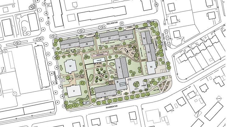 - Grönområdet i det sydöstra hörnet görs om till en mindre park. De privata bostadsgårdarna ska bindas samman i en gemensam grön innergård.