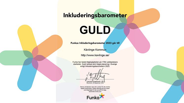 I slutet av september 2023 testade Funka tillgängligheten på 1784 webbplatsers startsidor. Endast 309 webbplatser klarade testet. Kävlinge kommuns webbplats www.kavlinge.se klarade det med bravur och tilldelas därför utmärkelsen GULD.