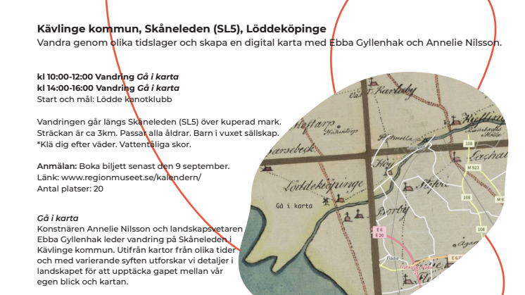 Upplev Vandringens dag med projektet Skåneleden Konst – In Motionlördagen den 11 september på Skåneleden i Kävlinge kommun. Det blir en spännande vandring med digitala inslag som kallas ”Gå i karta”, tillsammans med konstnären Annelie Nilsson och landskapsvetaren Ebba Gyllenhak.