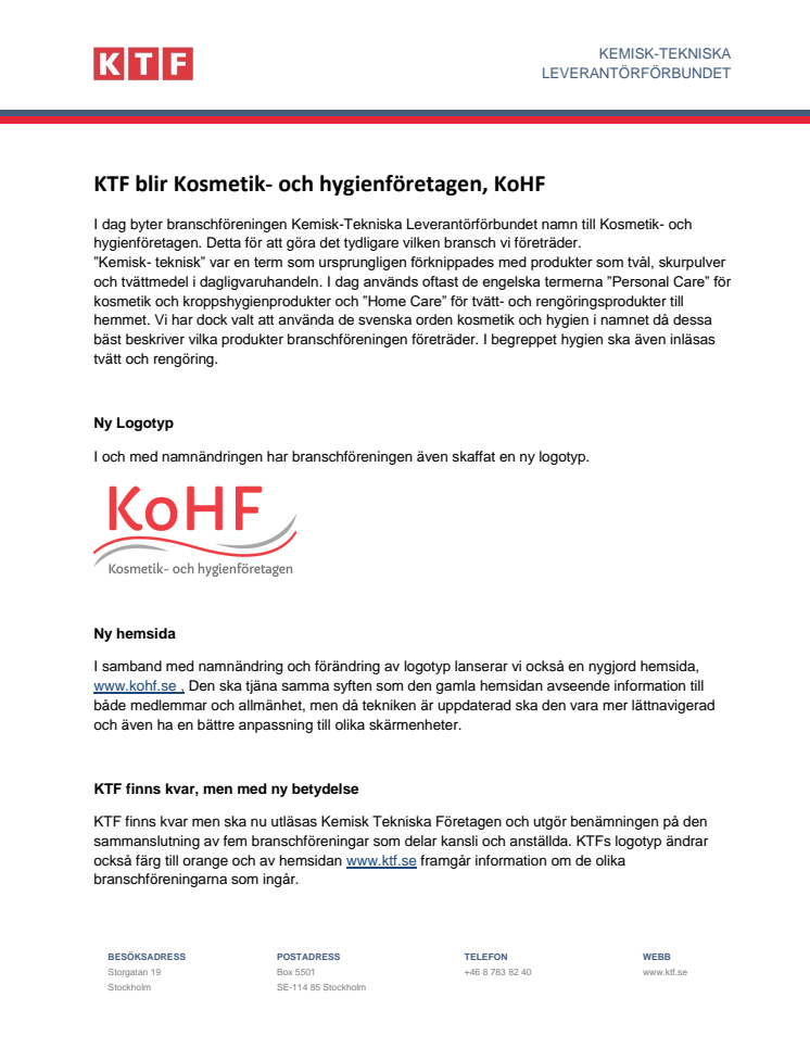 KTF blir Kosmetik- och hygienföretagen, KoHF