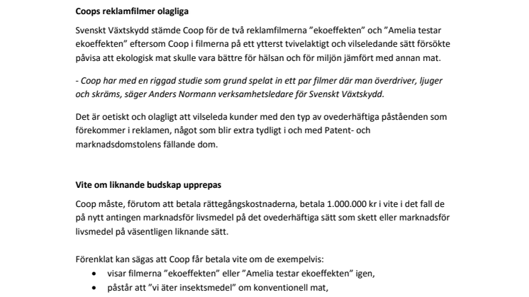 Svenskt Växtskydd stämde Coop för de två reklamfilmerna ”ekoeffekten” och ”Amelia testar ekoeffekten” eftersom Coop i filmerna på ett ytterst tvivelaktigt och vilseledande sätt försökte påvisa att ekologisk mat skulle vara bättre för hälsan och för miljön jämfört med annan mat.