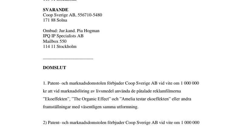 Coop måste, förutom att betala rättegångskostnaderna, betala 1.000.000 kr i vite i det fall de på nytt antingen marknadsför livsmedel på det ovederhäftiga sätt som skett eller marknadsför livsmedel på väsentligen liknande sätt.