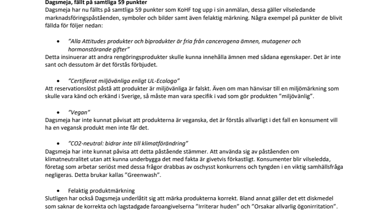 Dagsmeja har nu fällts på samtliga 59 punkter som KoHF tog upp i sin anmälan, dessa gäller vilseledande marknadsföringspåståenden, symboler och bilder samt även felaktig märkning. Några exempel på punkter de blivit fällda för följer nedan: