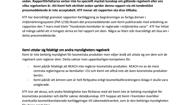 KTF har översiktligt granskat rapporten Kartläggning av begränsningar av farliga ämnen i miljömärkningssystem (PM 1/18) liksom det pressmeddelande som KemI publicerade med anledning av rapporten den 7 mars med titeln ”Hundratals kemikalier är reglerade i miljömärkta varor”. KTF har hittat så många sakfel att vi tvingats skriva en hel rapport om dem. Några av felen står översiktligt att läsa om i detta pressmeddelande.
