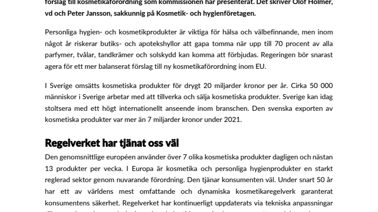 Vi välkomnar att EU arbetar fram en ny kemikaliestrategi, en del av den europeiska gröna given som ska ta större hänsyn till miljö och människors hälsa. Vi är dock bekymrade över det förslag till kosmetikaförordning som kommissionen har presenterat. Det skriver Olof Holmer, vd och Peter Jansson, sakkunnig på Kosmetik- och hygienföretagen.