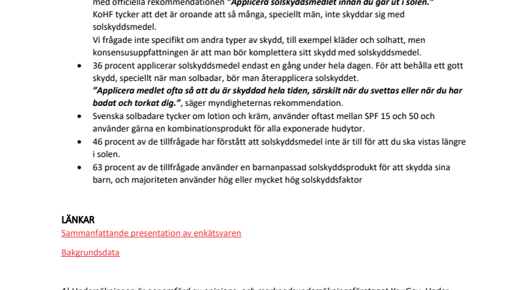 Vi frågade inte specifikt om andra typer av skydd, till exempel kläder och solhatt, men konsensusuppfattningen är att man bör komplettera sitt skydd med solskyddsmedel. - 36 procent applicerar solskyddsmedel endast en gång under hela dagen. För att behålla ett gott skydd, speciellt när man solbadar, bör man återapplicera solskyddet.