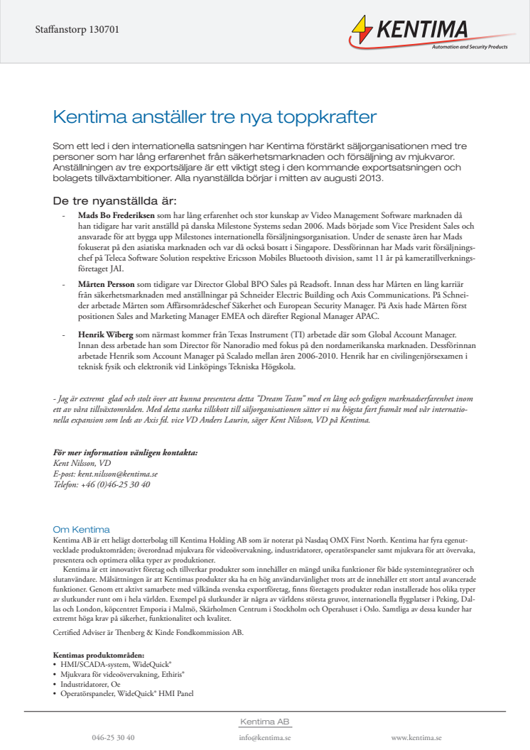 Som ett led i den internationella satsningen har Kentima förstärkt säljorganisationen med tre personer som har lång erfarenhet från säkerhetsmarknaden och försäljning av mjukvaror. Anställningen av tre exportsäljare är ett viktigt steg i den kommande exportsatsningen och bolagets tillväxtambitioner. Alla nyanställda börjar i mitten av augusti 2013.