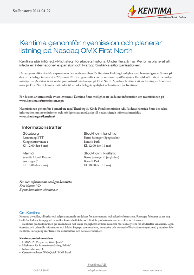 Kentima genomför nyemission och planerar listning på Nasdaq OMX First North