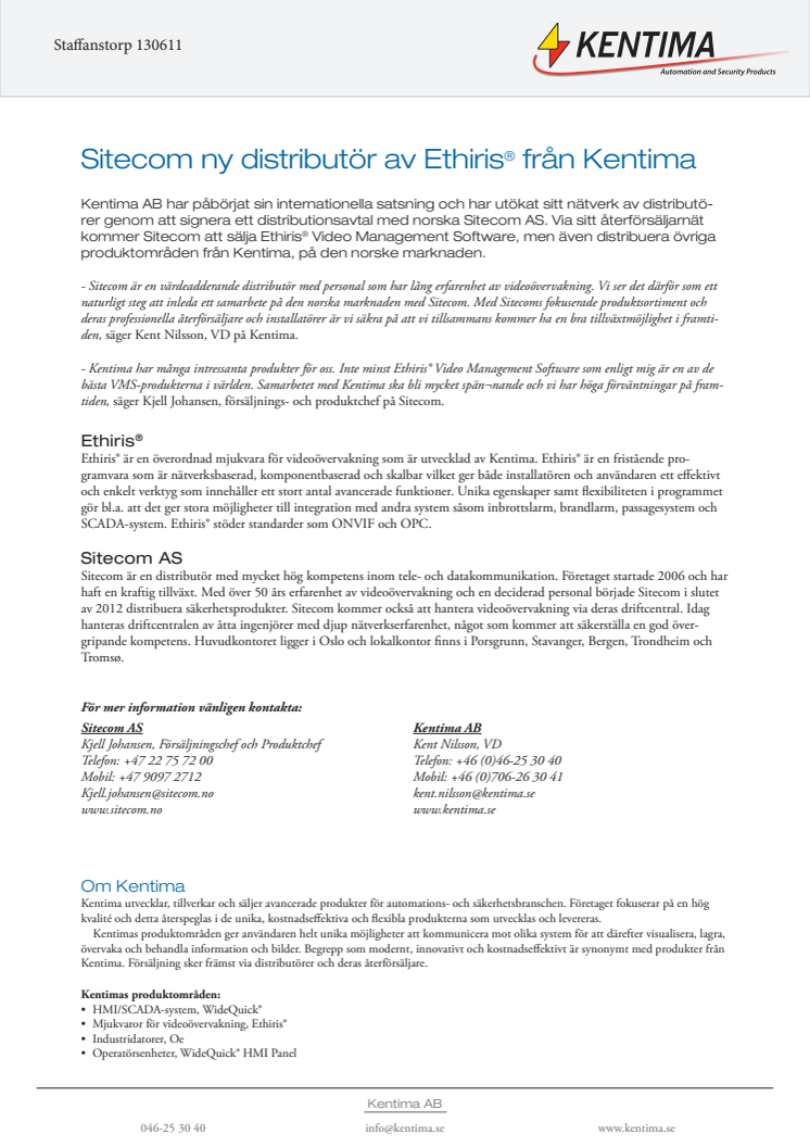 Kentima AB har påbörjat sin internationella satsning och har utökat sitt nätverk av distributörer genom att signera ett distributionsavtal med norska Sitecom AS. Via sitt återförsäljarnät kommer Sitecom att sälja Ethiris Video Management Software, men även distribuera övriga produktområden från Kentima, på den norske marknaden.