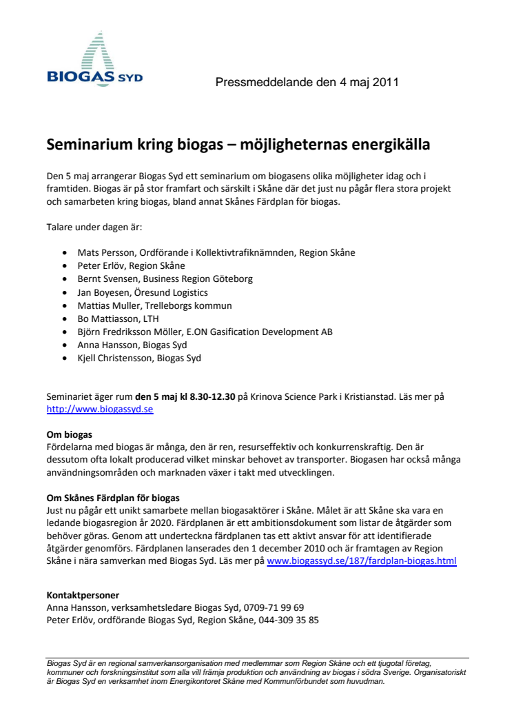 Den 5 maj arrangerar Biogas Syd ett seminarium om biogasens olika möjligheter idag och i framtiden. Biogas är på stor framfart och särskilt i Skåne där det just nu pågår flera stora projekt och samarbeten kring biogas, bland annat Skånes Färdplan för biogas.