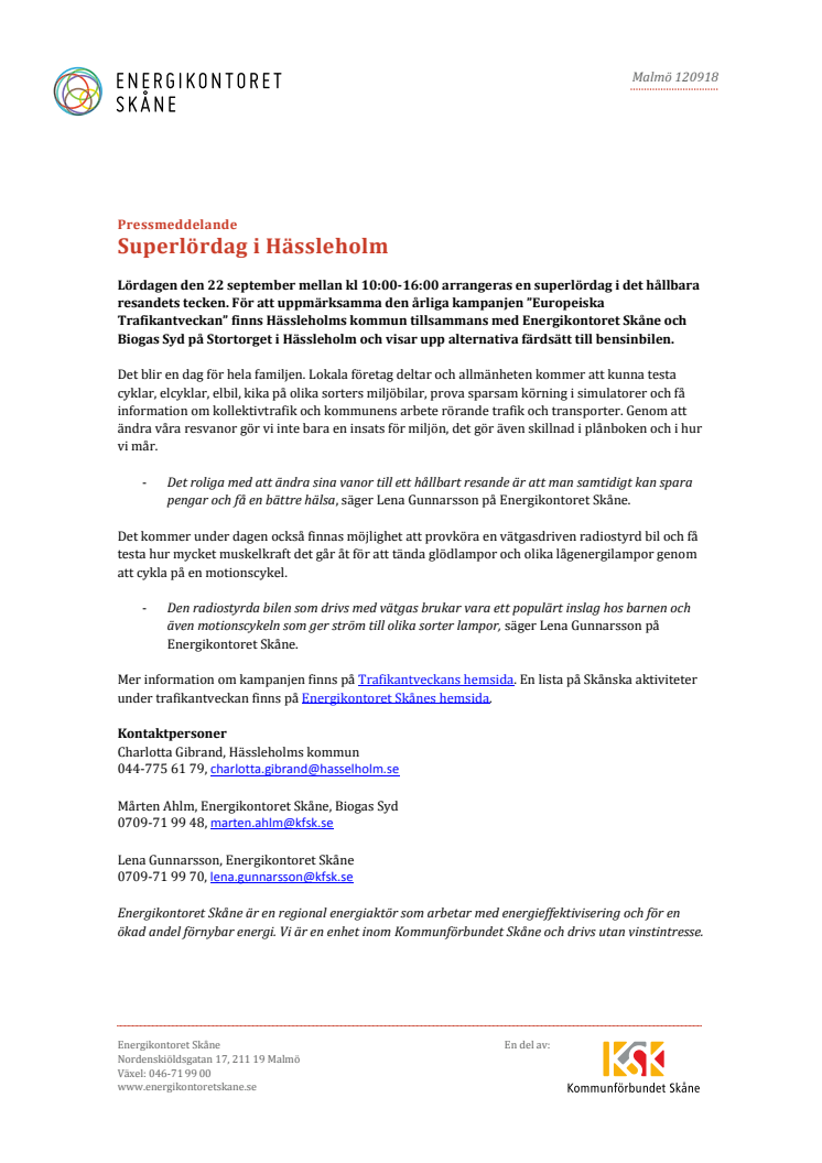Lördagen den 22 september mellan kl 10:00-16:00 arrangeras en superlördag i det hållbara resandets tecken. För att uppmärksamma den årliga kampanjen ”Europeiska Trafikantveckan” finns Hässleholms kommun tillsammans med Energikontoret Skåne och Biogas Syd på Stortorget i Hässleholm och visar upp alternativa färdsätt till bensinbilen.