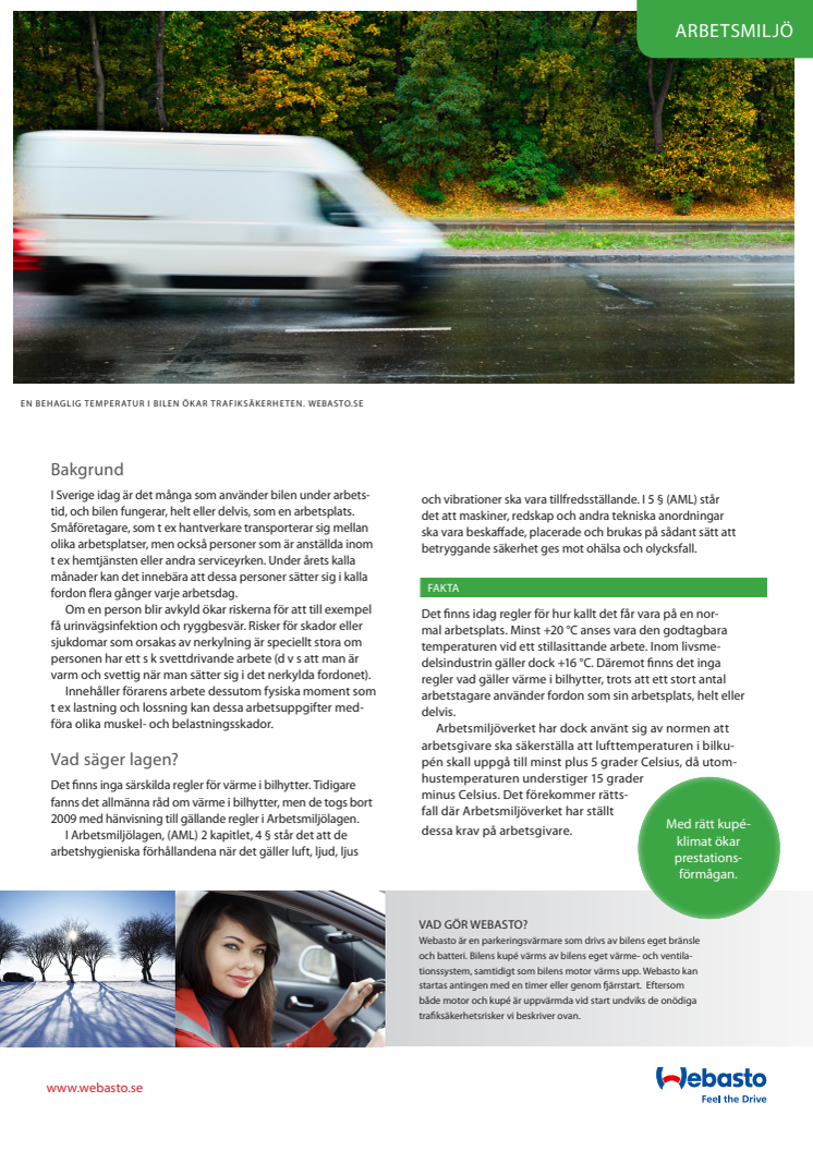 I Sverige idag är det många som använder bilen under arbetstid, och bilen fungerar, helt eller delvis, som en arbetsplats. Småföretagare, som t ex hantverkare transporterar sig mellan olika arbetsplatser, men också personer anställda inom t ex hemtjänsten eller andra serviceyrken. Under årets kalla månader kan det innebära att dessa personer sätter sig i kalla fordon flera gånger varje arbetsdag.