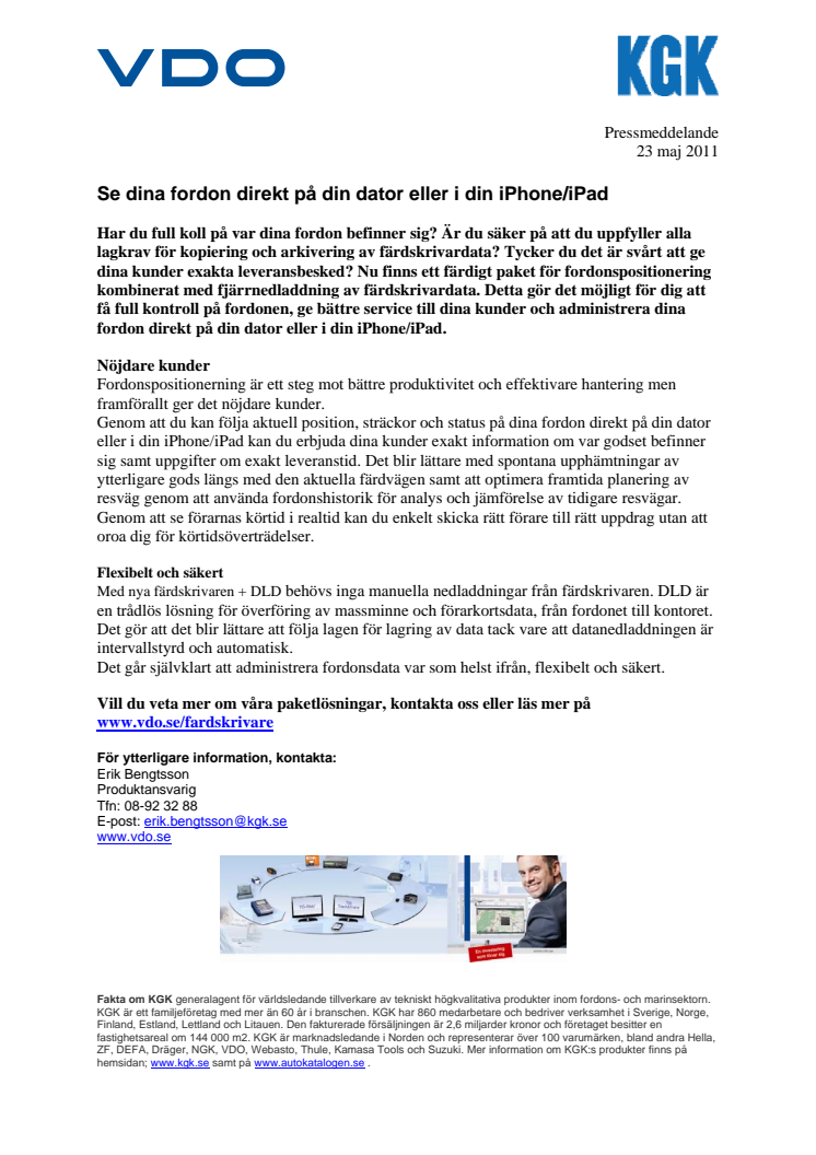 Har du full koll på var dina fordon befinner sig? Är du säker på att du uppfyller alla lagkrav för kopiering och arkivering av färdskrivardata? Nu finns ett färdigt paket för fordonspositionering kombinerat med fjärrnedladdning av färdskrivardata. Få full kontroll på fordonen, ge bättre service till dina kunder och administrera dina fordon direkt på din dator eller i din iPhone/iPad.