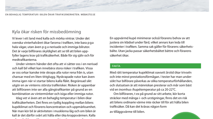 Idag vet vi även att en behaglig temperatur i bilen ökar trafiksäkerheten. Det finns en tydlig koppling mellan bilens kupéklimat och förarens koncentration och uppmärksamhet. När man kör bil är aktiviteten i musklerna låg och om bilen är kall är det därför svårt att hålla eller öka kroppsvärmen. Kalla och nerkylda muskler reagerar saktare än varma och prestationsförmågan försämras. Vi vet även att obehag av kyla ökar risken för missbedömningar.
