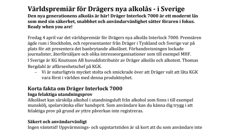 Fredag 4 april var det världspremiär för Drägers nya alkolås Interlock 7000. Premiären ägde rum i Stockholm, och representanter från Dräger i Tyskland och Sverige var på plats för att presentera det banbrytande alkolåset. Förhandsvisningen lockade journalister, återförsäljare, fordonstillverkare som Volvo och Scania samt olika intresseorganisationer som till exempel MHF.
