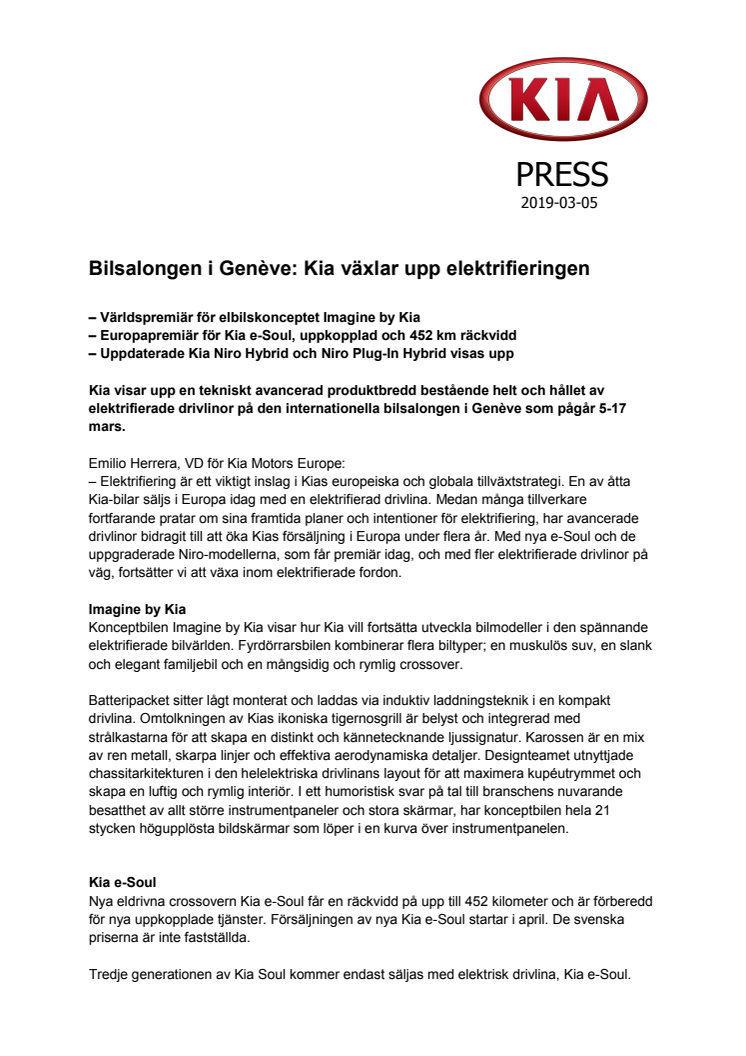 Premiär för elbilskonceptet Imagine by Kia, elbilen Kia e-Soul och uppdaterade Kia Niro Hybrid och Niro Plug-In Hybrid.