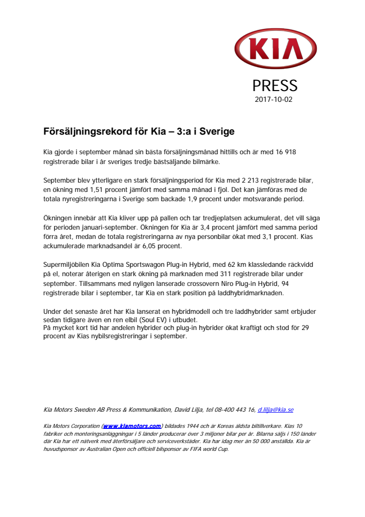 Kia gjorde i september sin bästa försäljningsmånad hittills och är med 16 918 registrerade bilar i år sveriges tredje bästsäljande bilmärke.